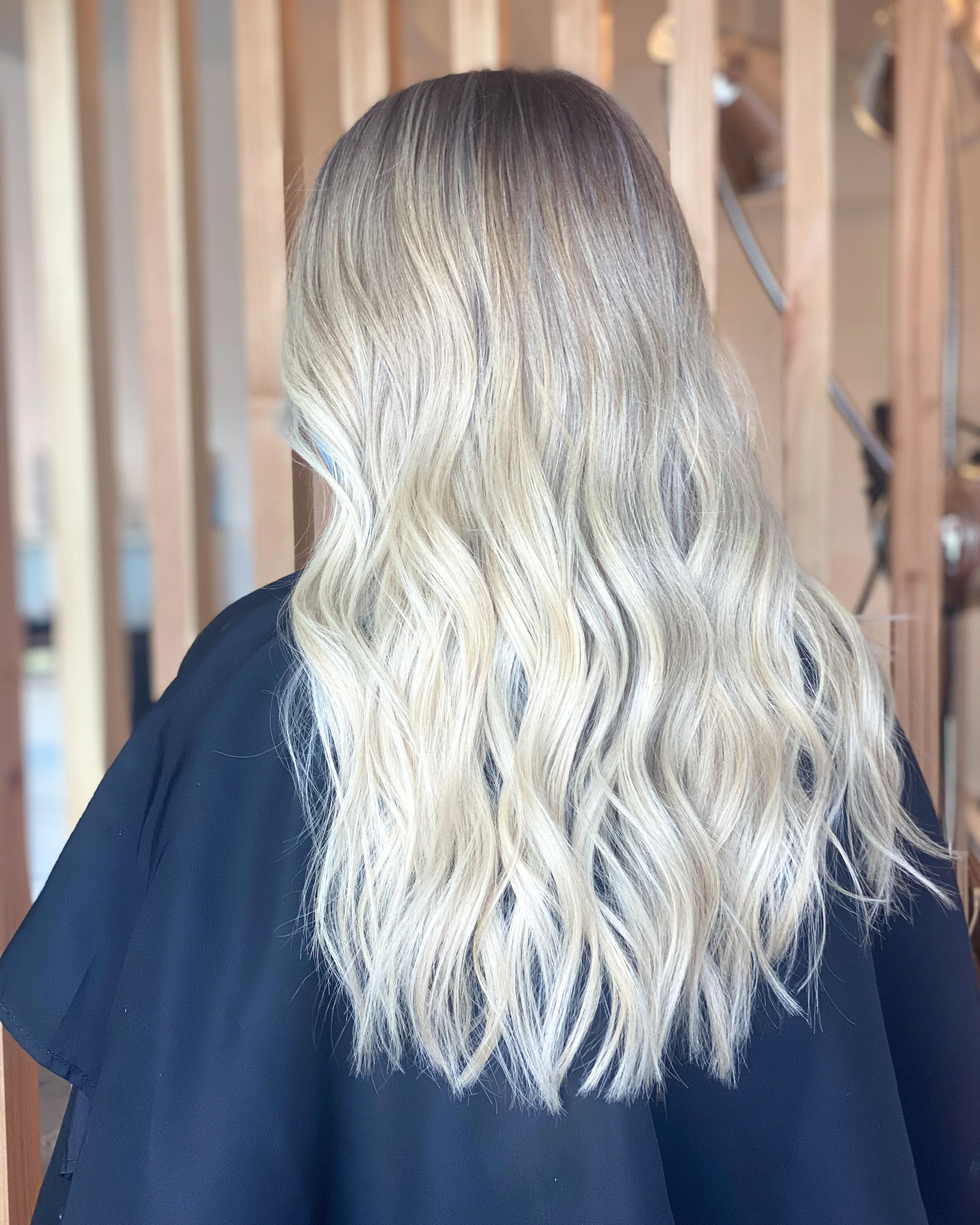 Natural Root Melting Into Platinum Blonde Balayage Hair By Danni In Denver Co Blonde Hair Natural Roots Platinum Blonde Balayage Balayage Hair Brunette Long